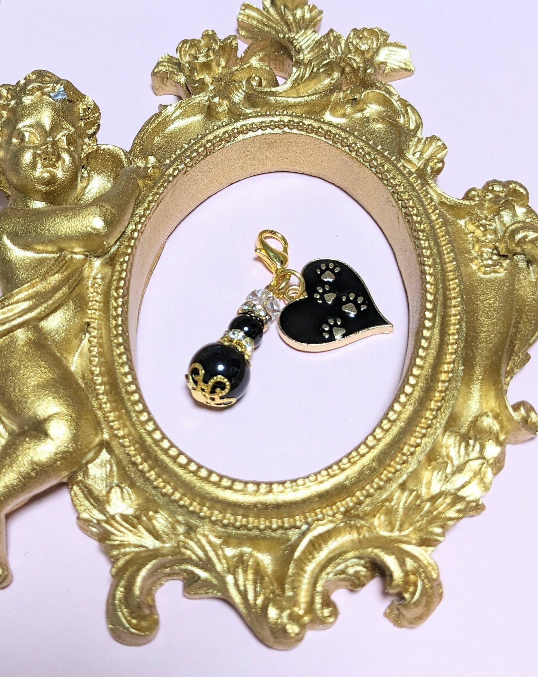 ブラックオニキスと足跡がついたハートのチャームの組み合わせのアクセサリー。