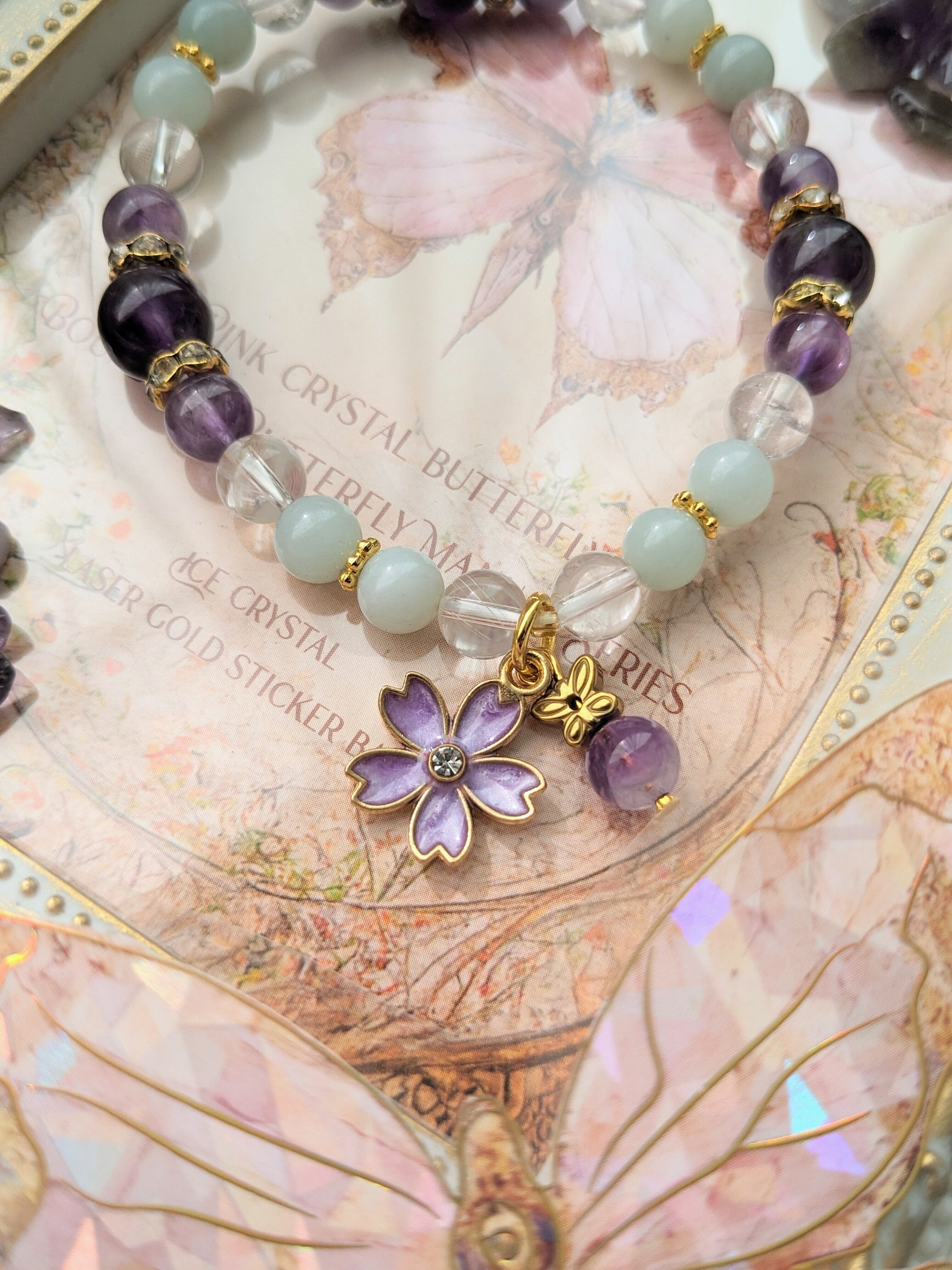 大地のエネルギーと美しさを身に纏う、アメジスト・ヘマタイト・花・蝶々・アマゾナイトのブレスレット。パワーストーンの持つパワフルな力強さと、花や蝶々の可憐さが融合したブレスレットです。