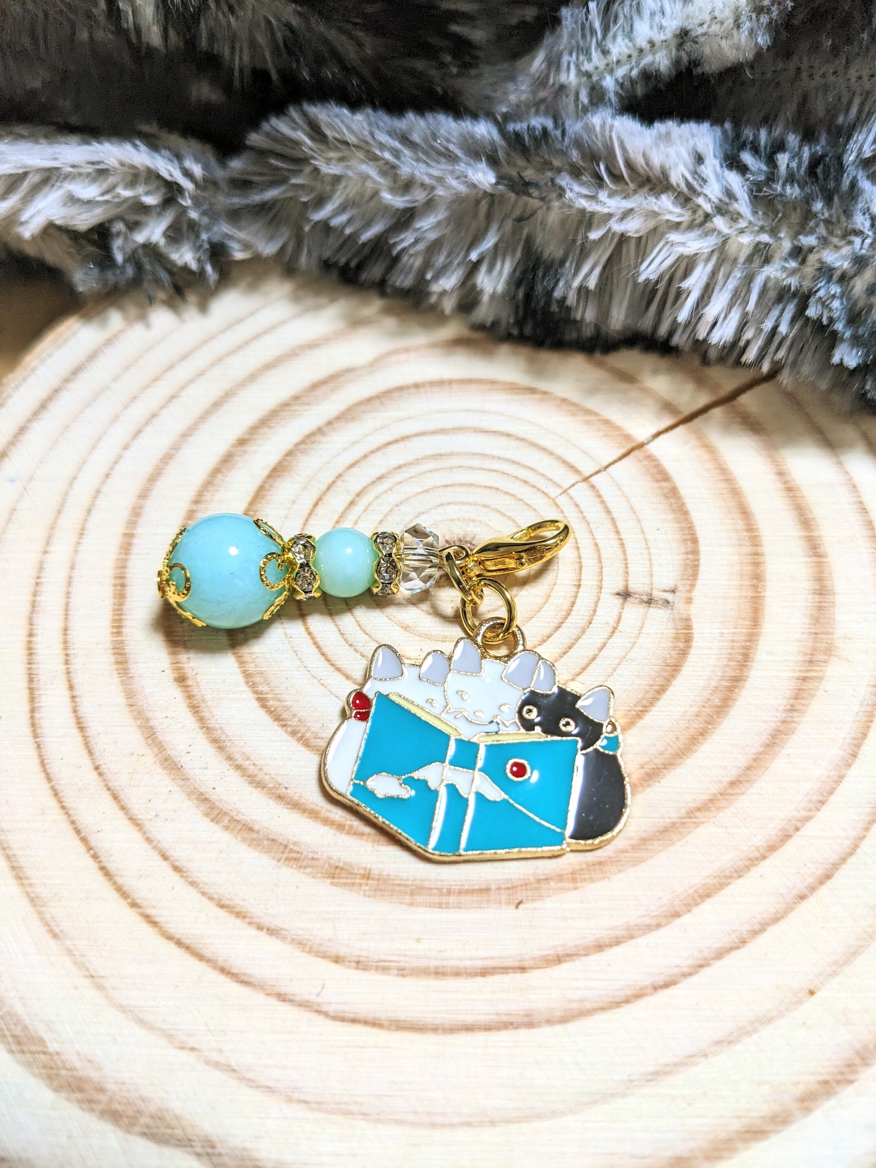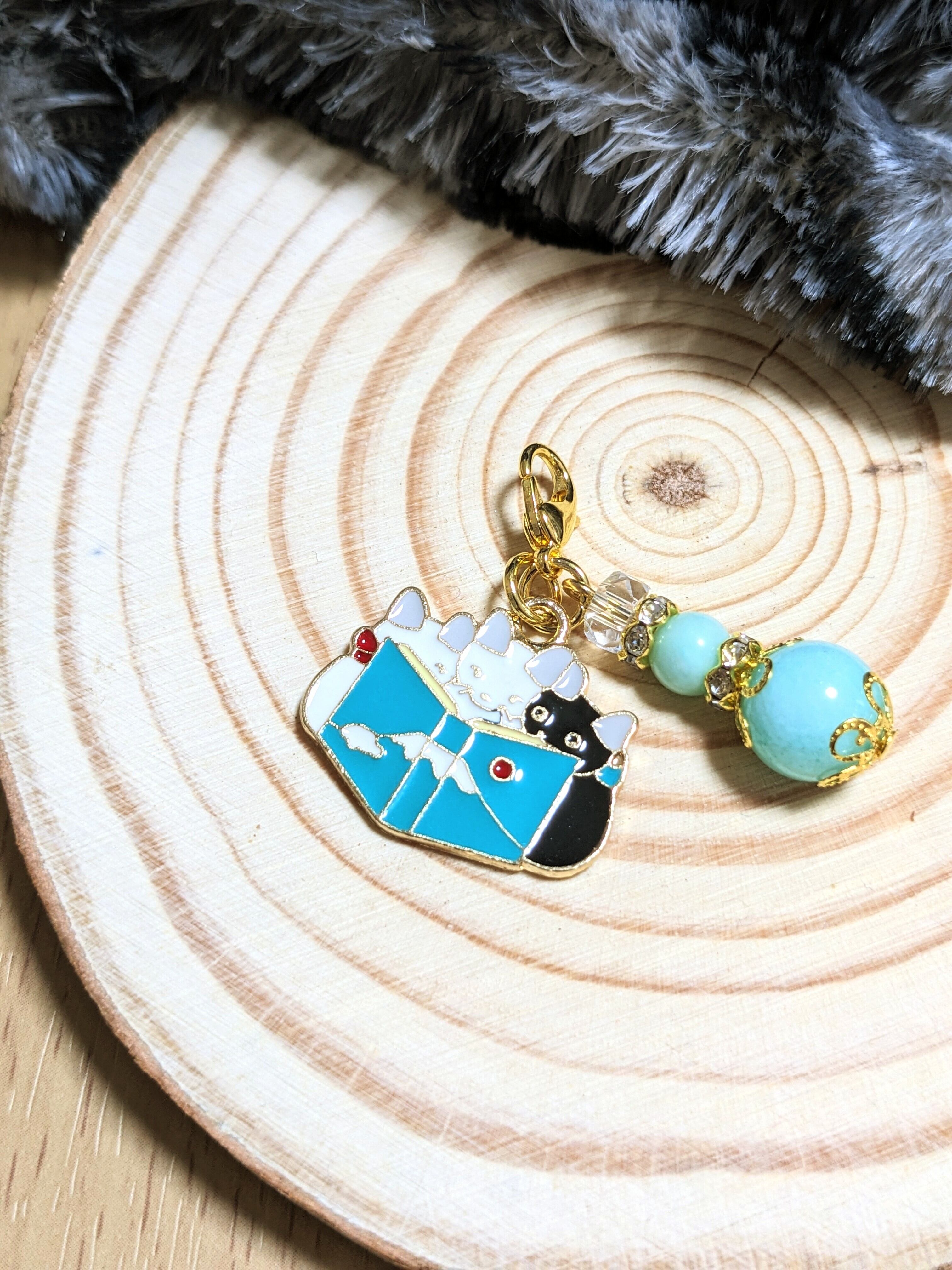 本を読むネコちゃんとジェードグリーンのチャームです♡