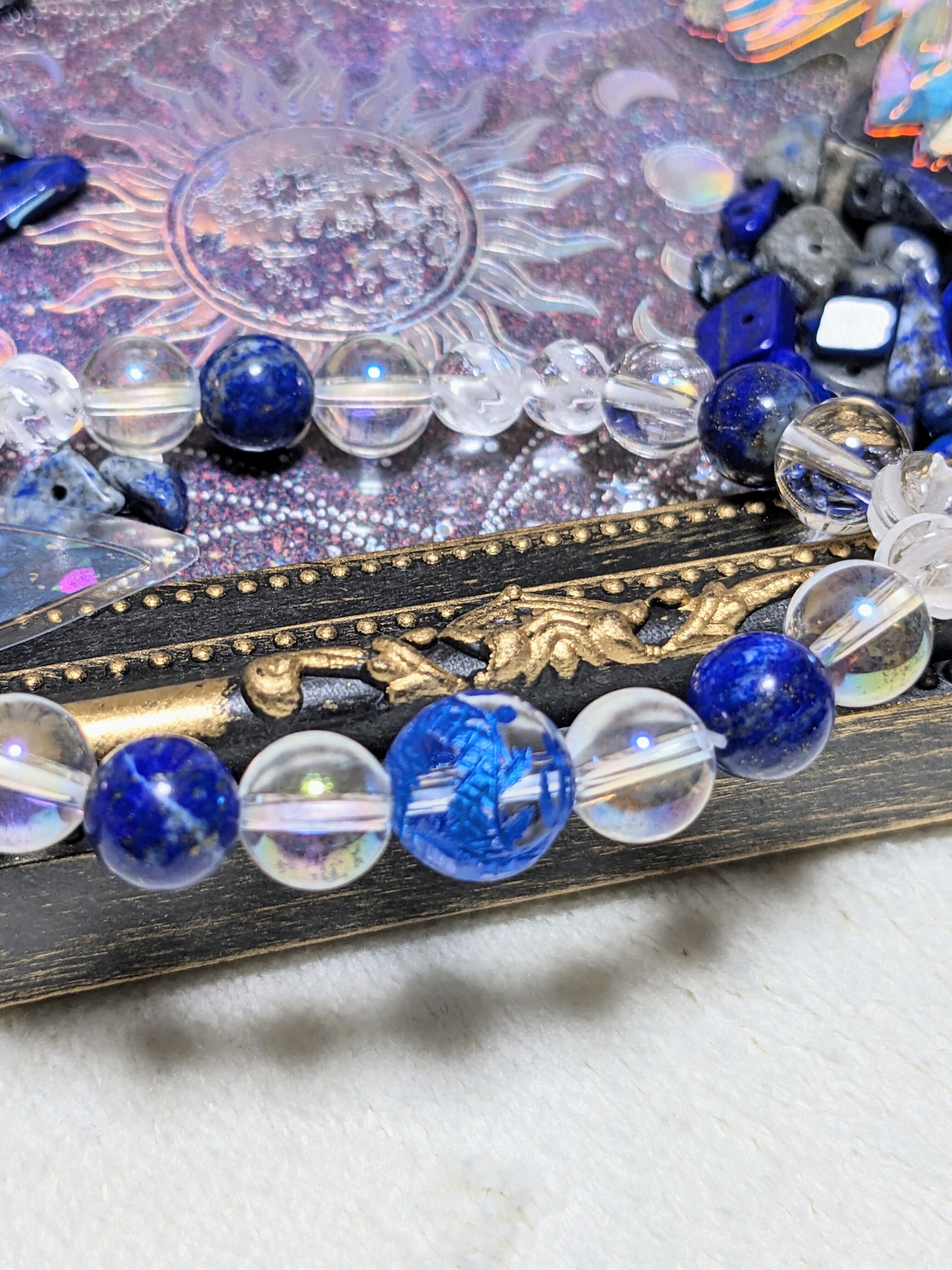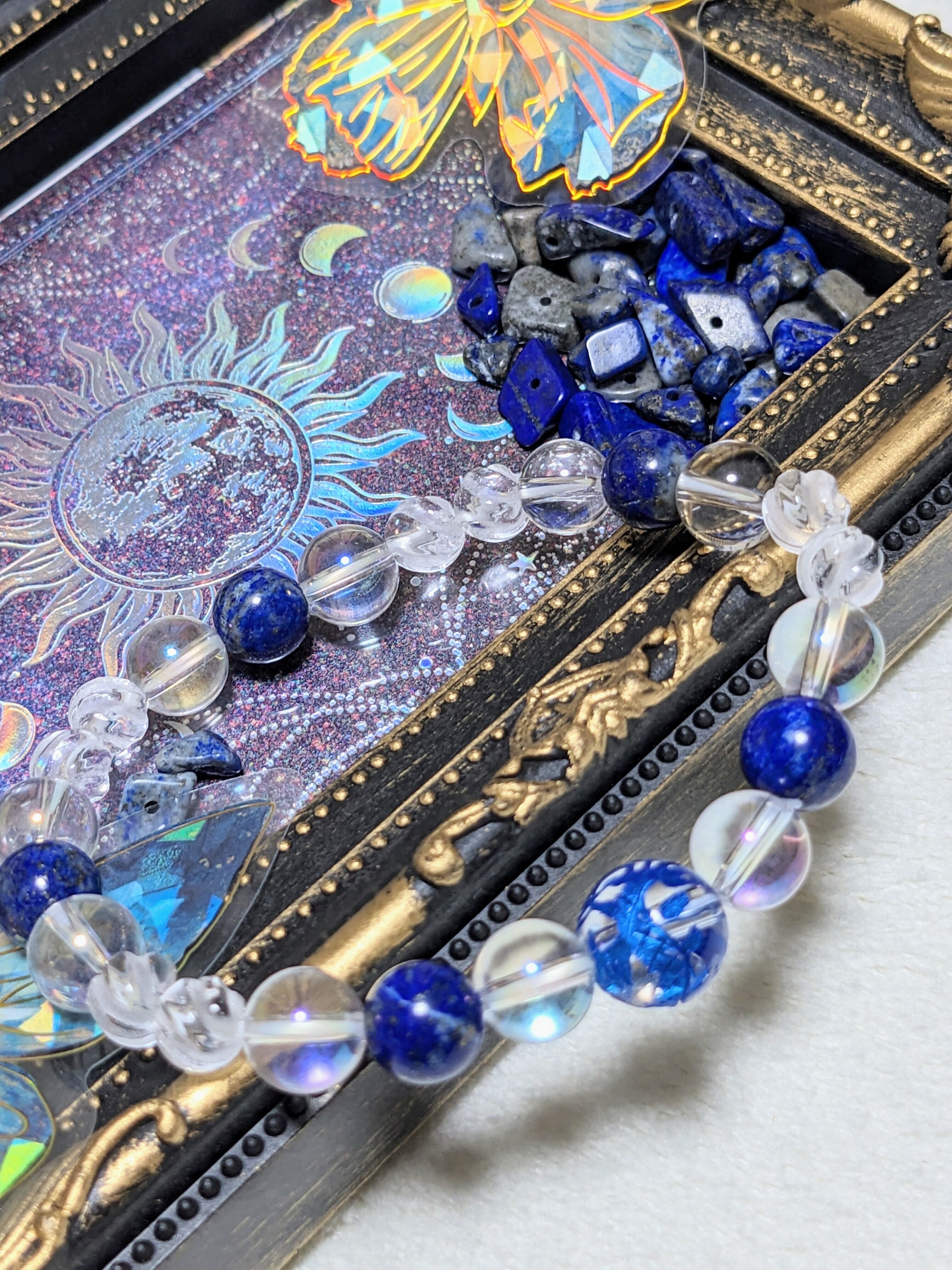 水晶に青色の龍彫りを施したストーンとラピスラズリ、オーラ水晶、ツイストカット水晶のブレスレットです。