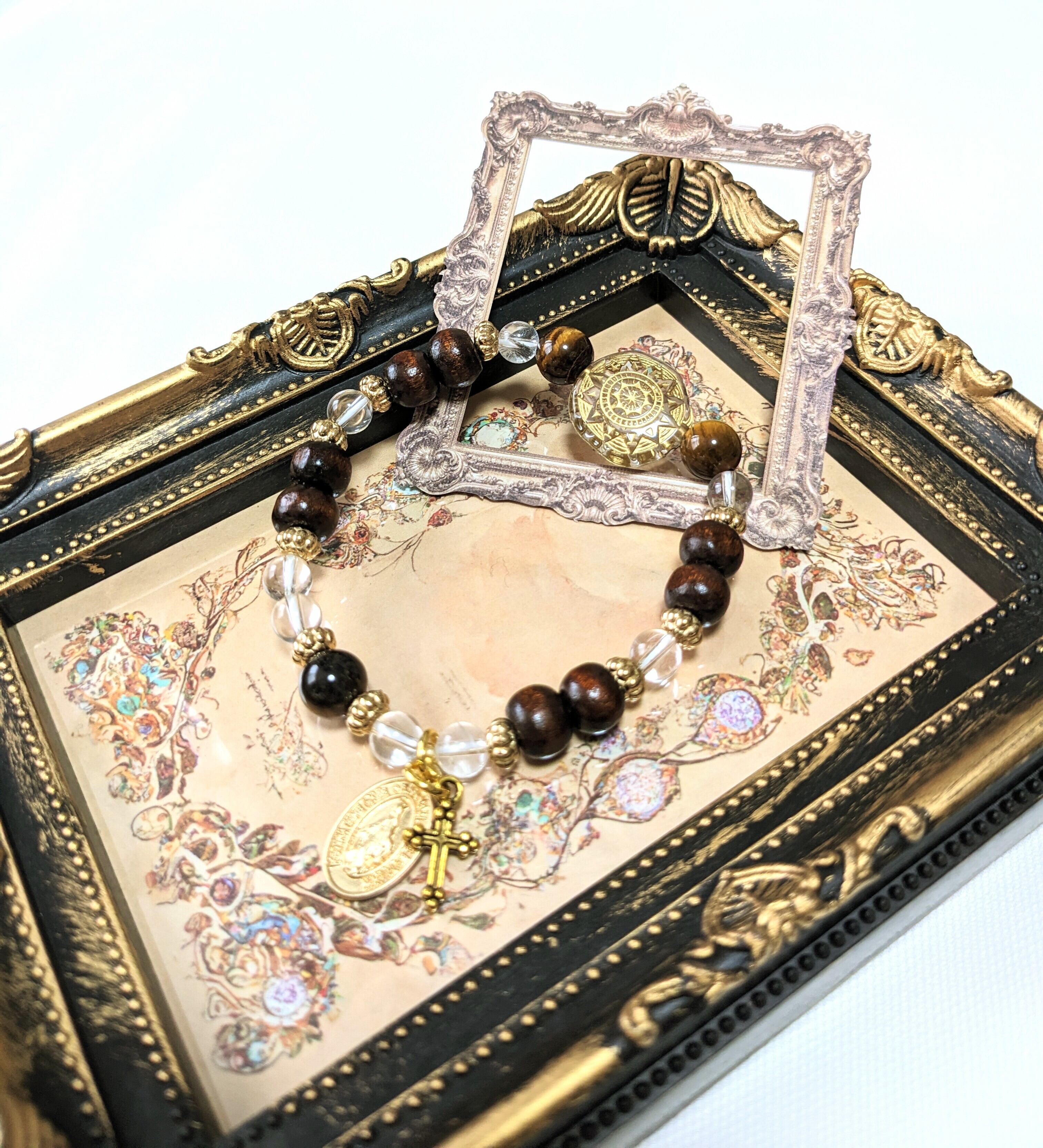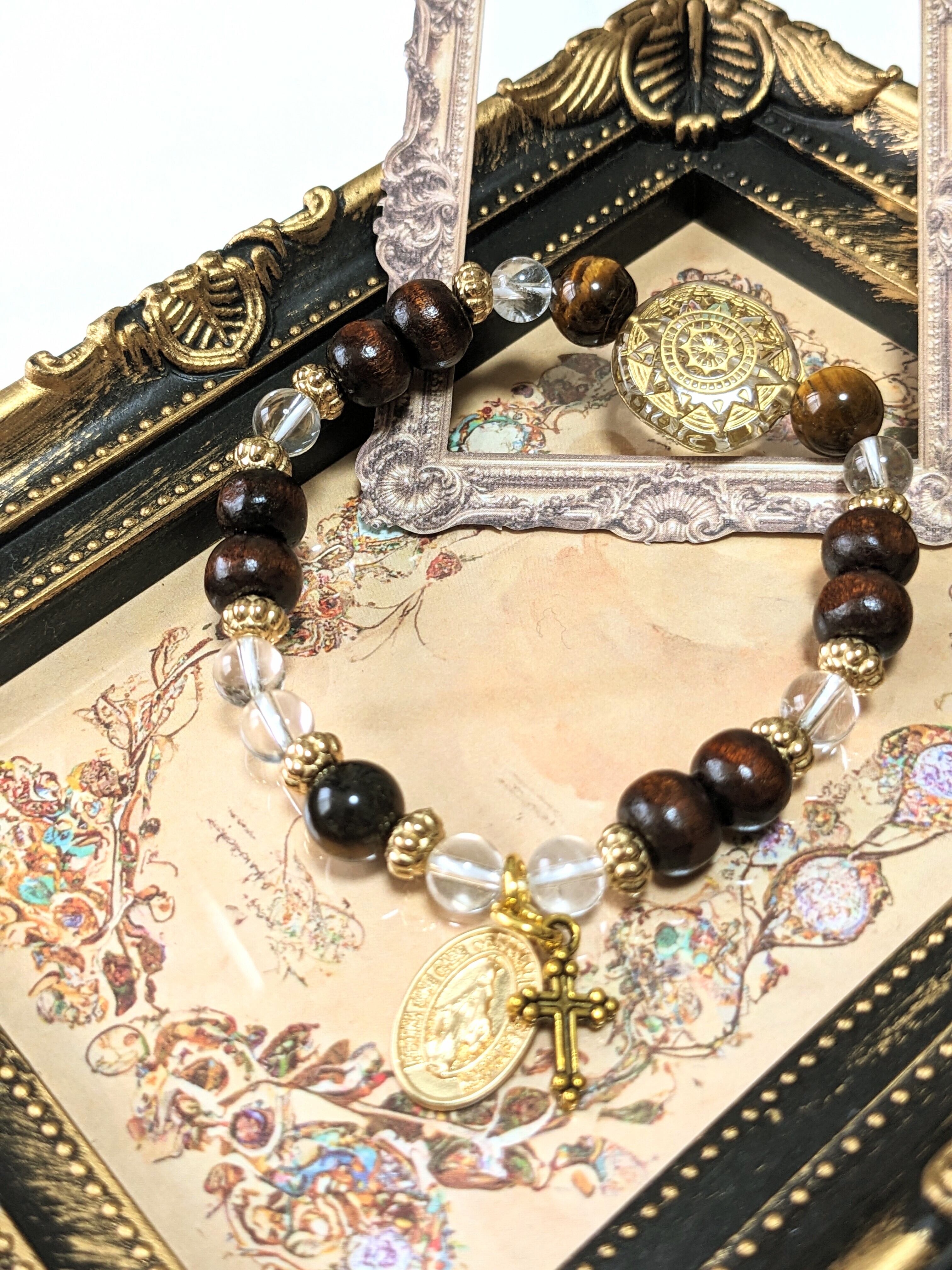 マリア様とクロスのチャームとパワーストーン、ウッドビーズ、アンティークビーズを組み合わせたこのブレスレットは、どこか懐かしさを感じるデザインが特徴です。