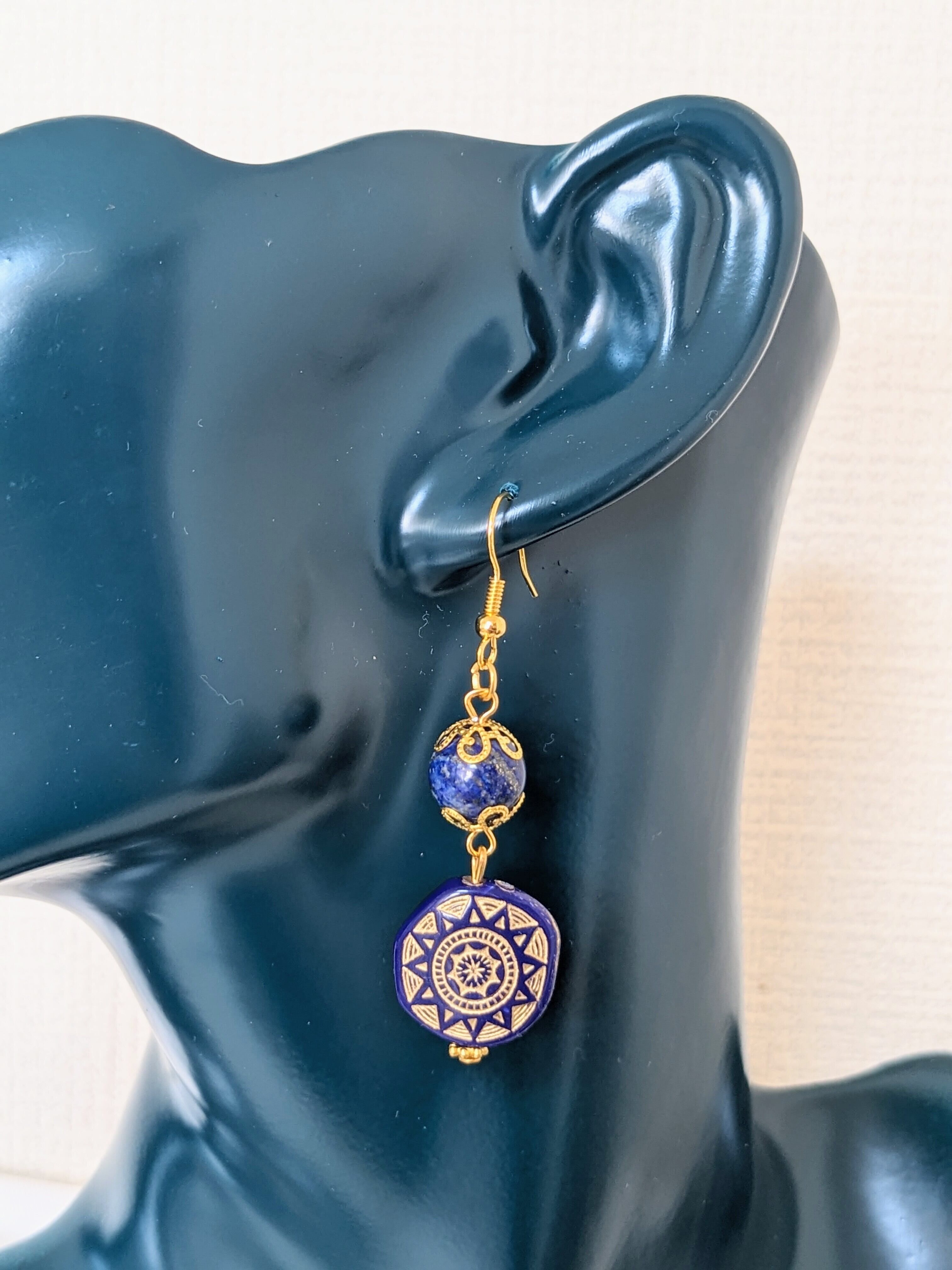 ラピスラズリとアンティークビーズが織りなす美しいデザインのピアスです。