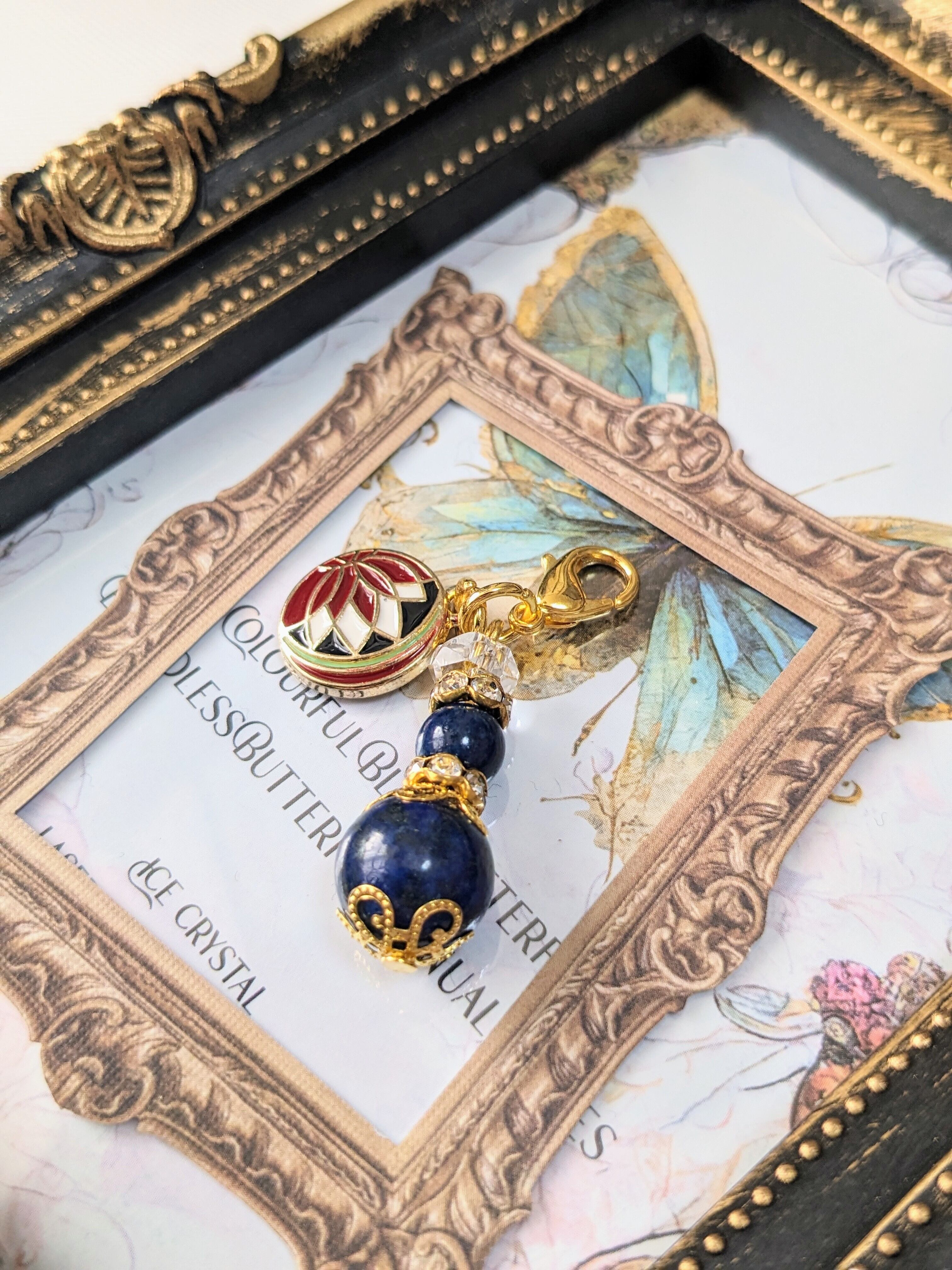 美しい蓮の花と深い青色のラピスラズリが融合した、魅惑的なチャームです。
