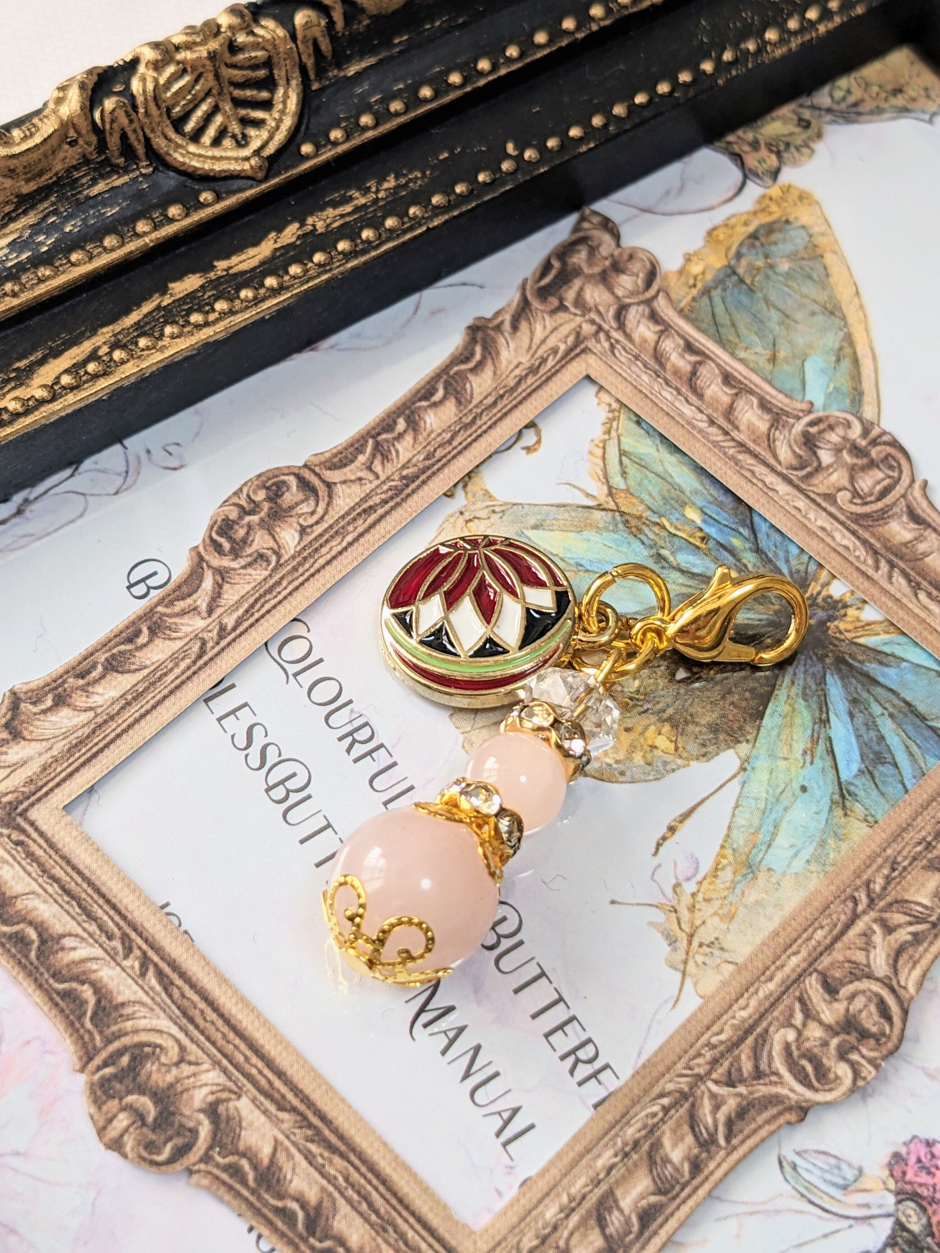 このチャームは、和のシンボルである蓮の花と、愛と美を象徴するローズクォーツが組み合わさったアイテムです。